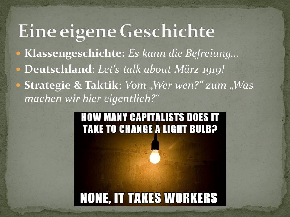 Wie läßt sich die revolutionäre Geschichte, die in all diesen Erzählungen wie abseits von ihnen zu finden ist, in diesem oder in den kommenden Jahren auf den Tisch bringen? Historical reenactment der Kämpfe, Streiks und Besetzungen an jedem Ort, wo sich das organisieren läßt? Oder doch erst die Schaffung von Zusammenschlüssen, die mehr Interesse an dieser Geschichte wecken?